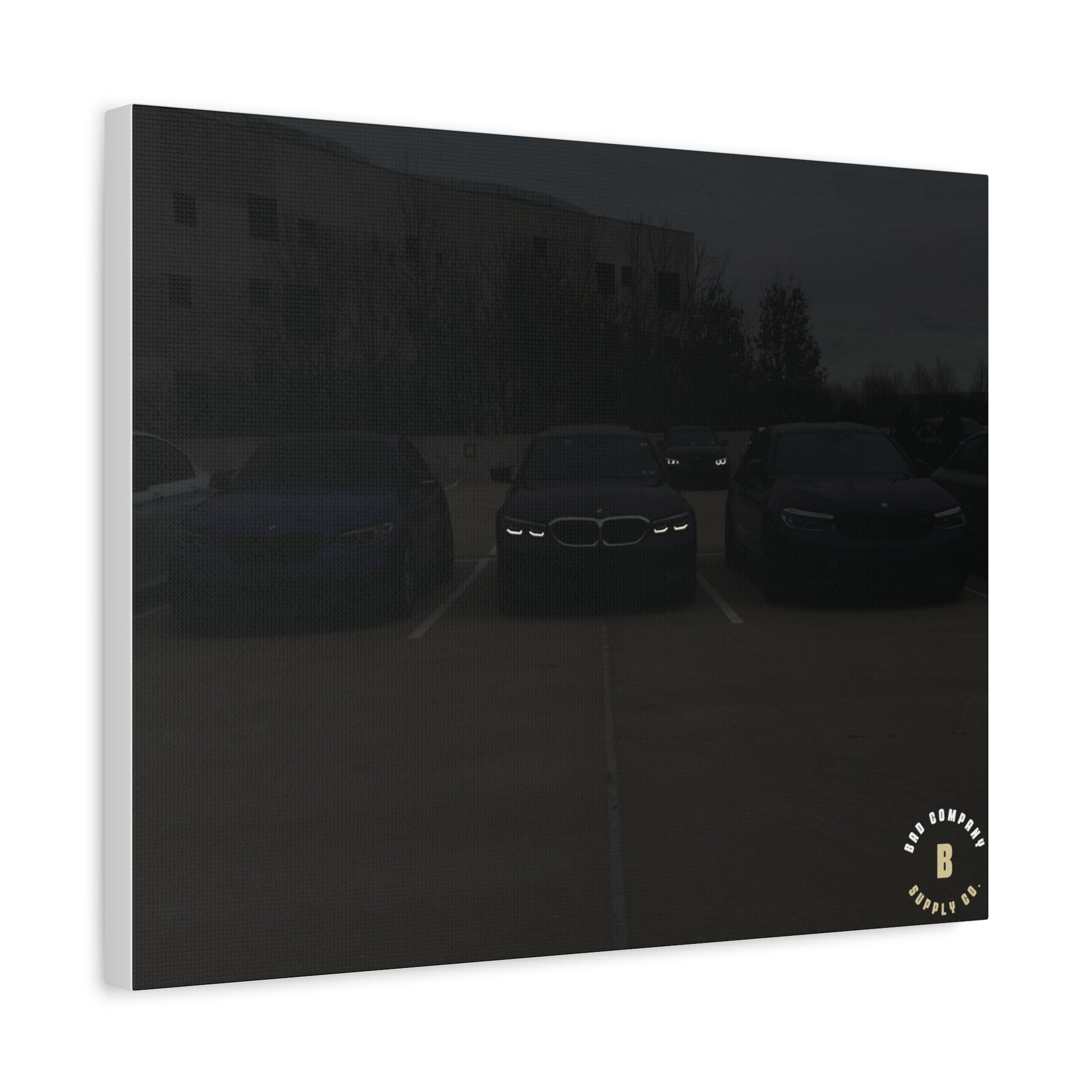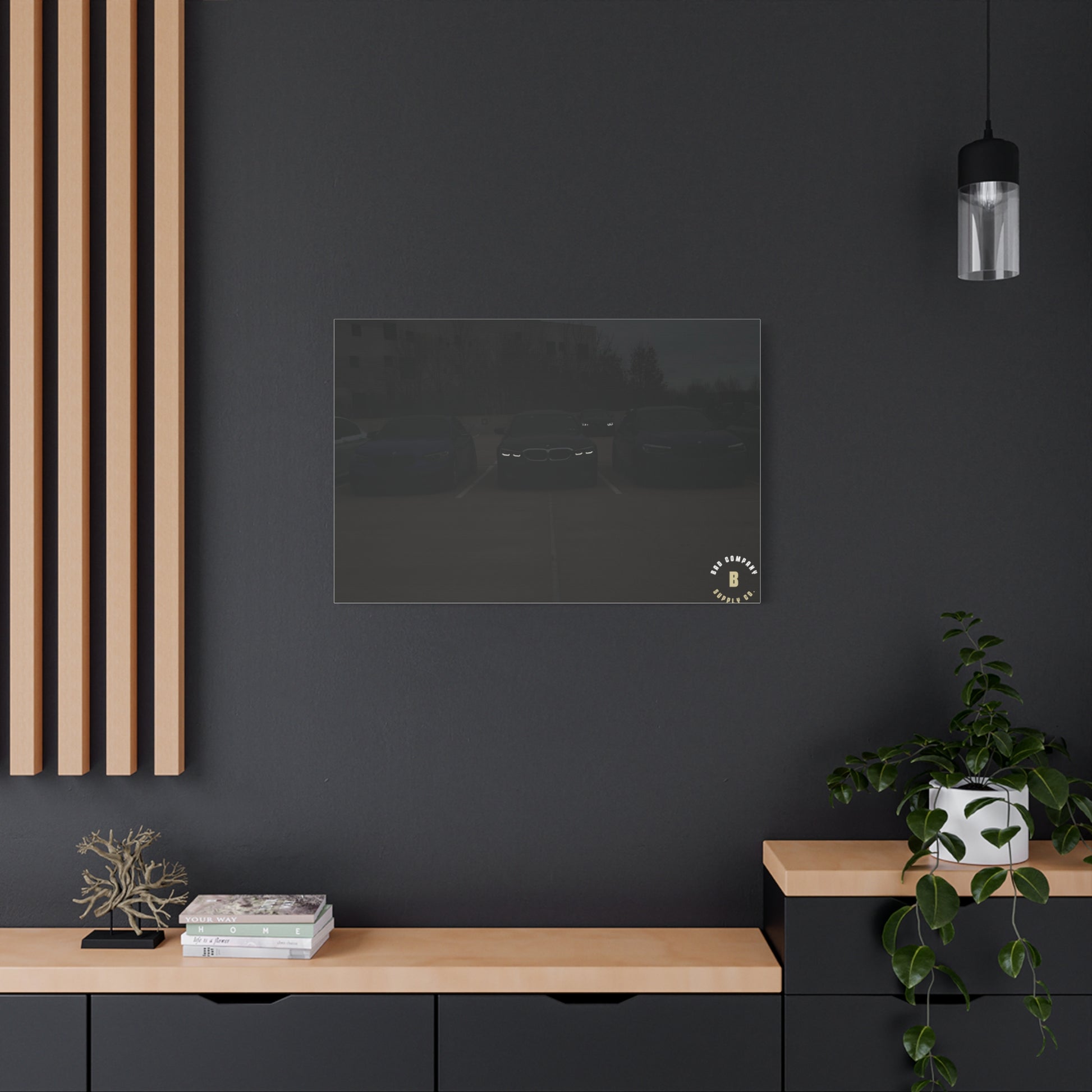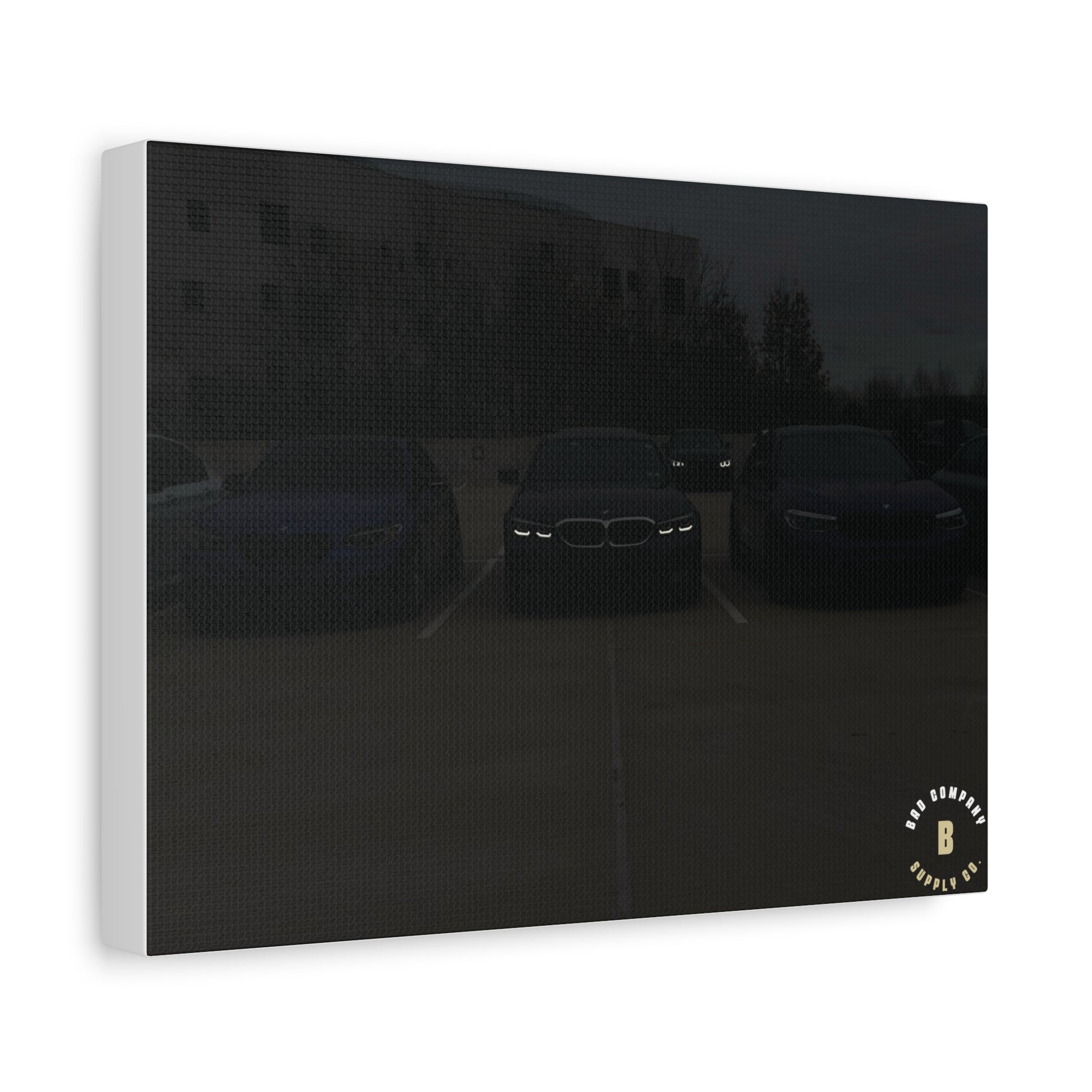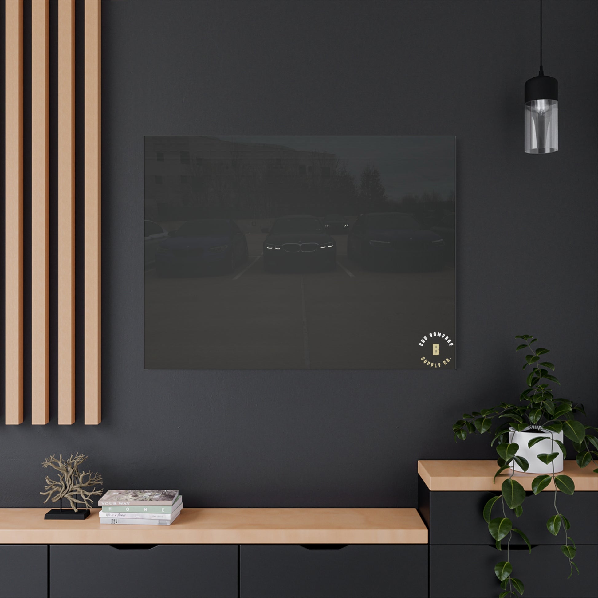 A bold shot of BMWs lined up with their signature headlights glowing, captured in a moody parking lot scene. Printed on premium matte canvas, this piece brings an understated yet powerful presence to any wall. Perfect for car enthusiasts who appreciate sleek design and raw automotive attitude.
