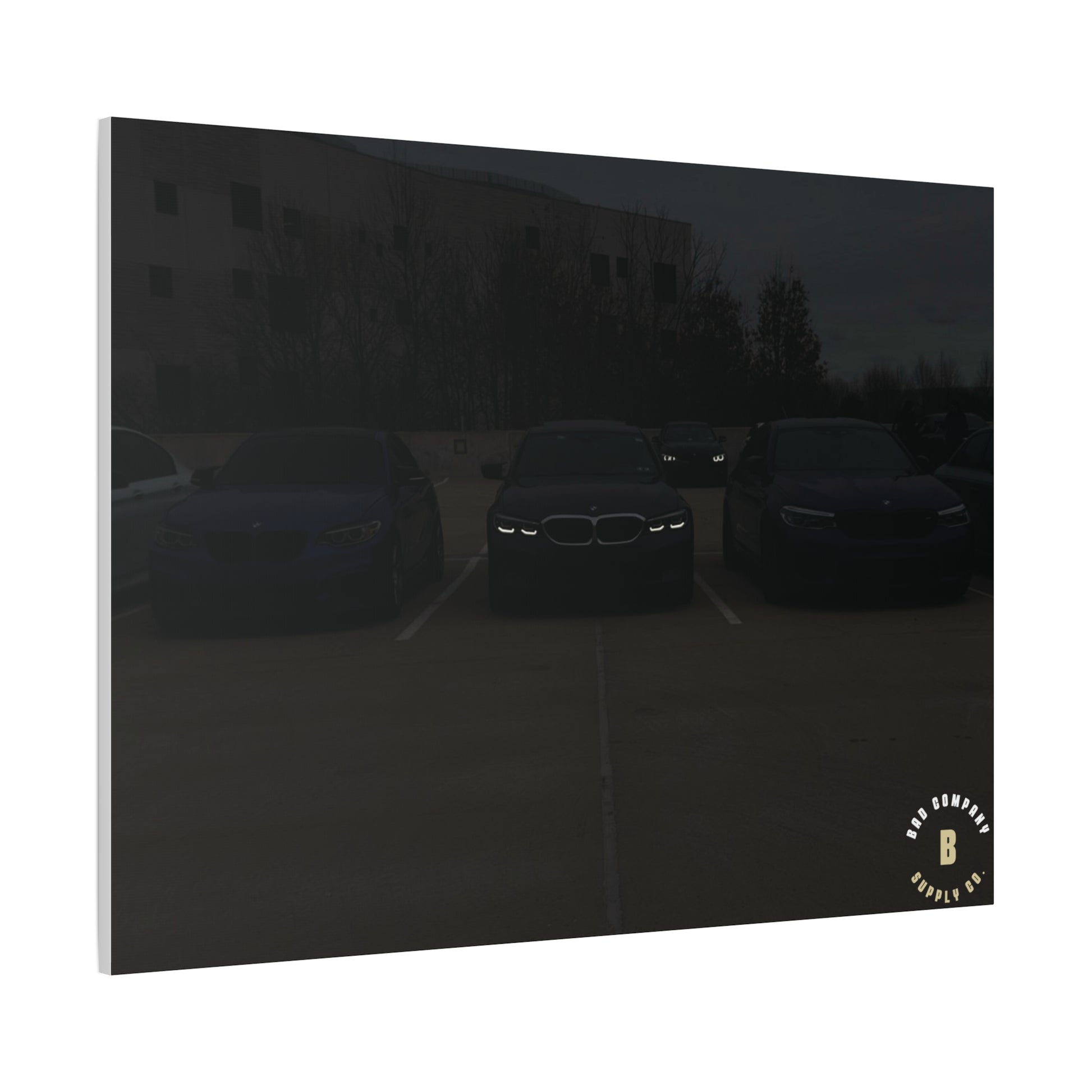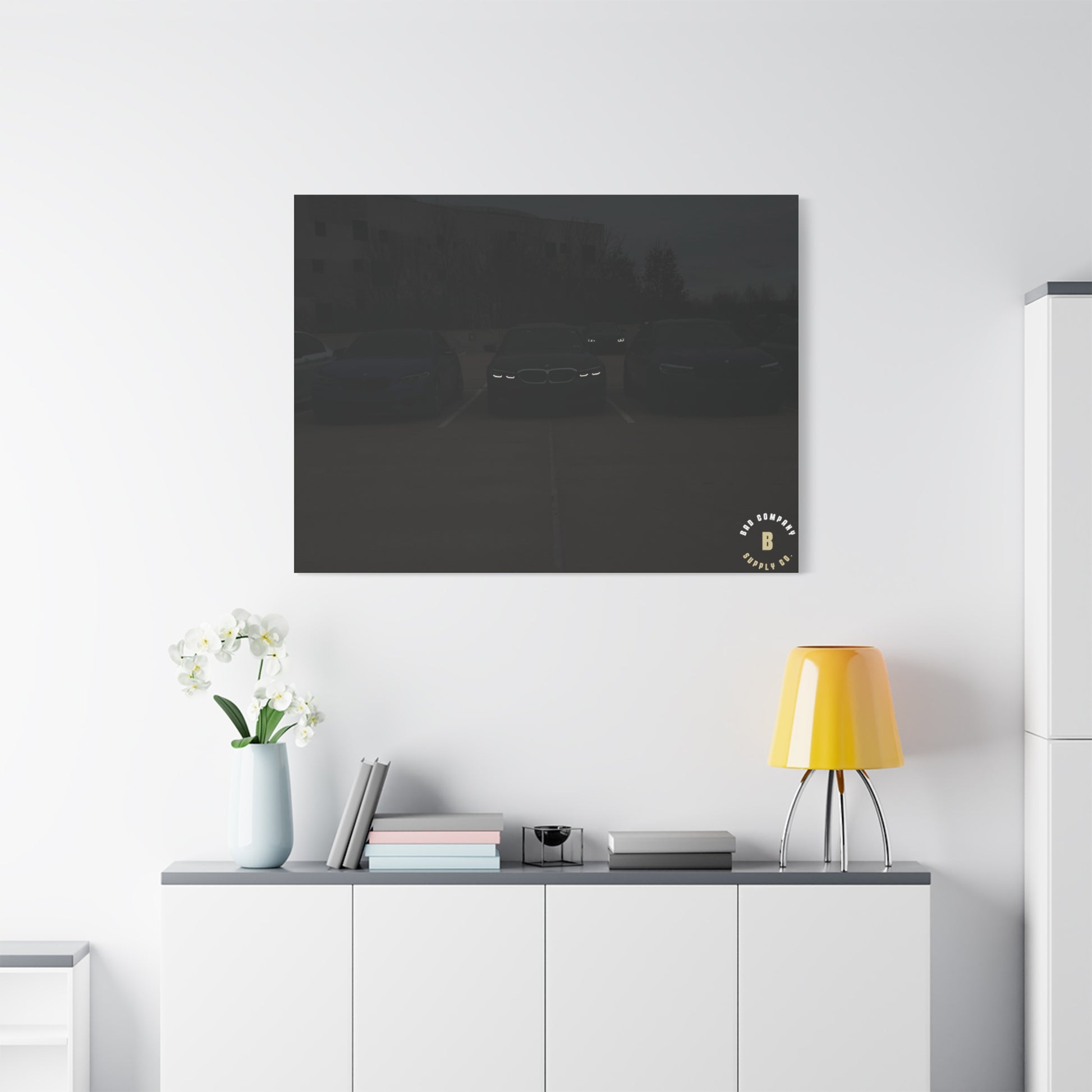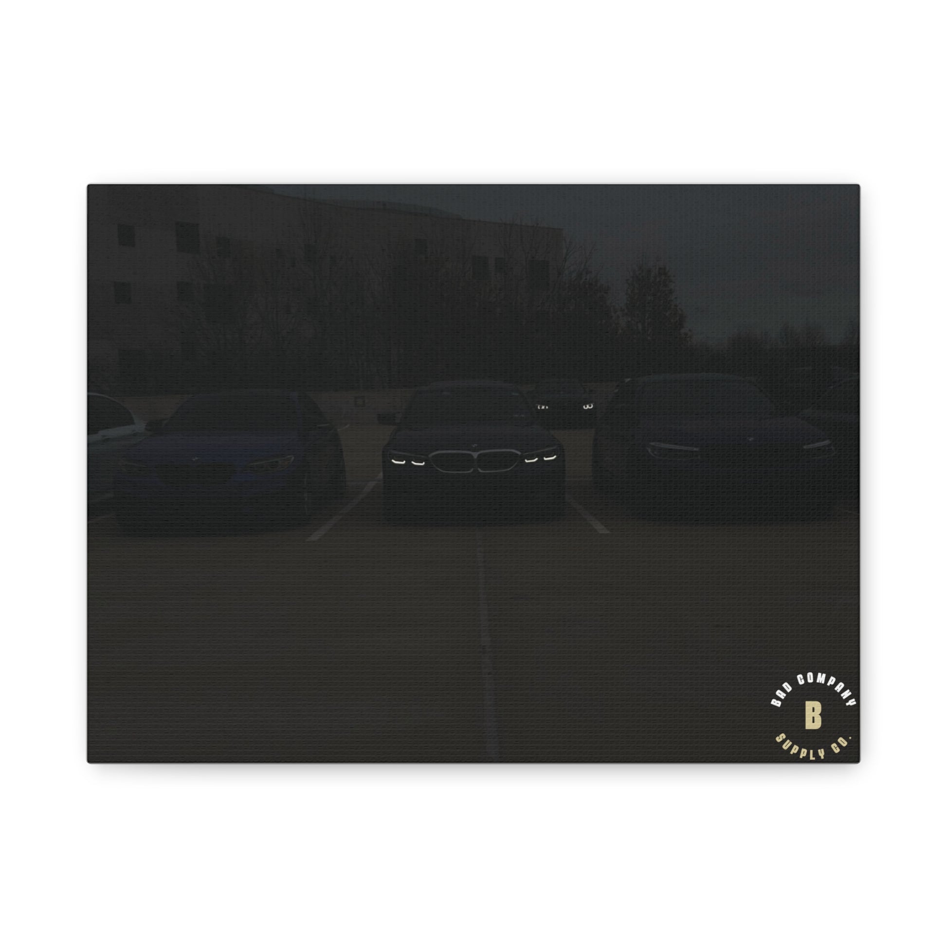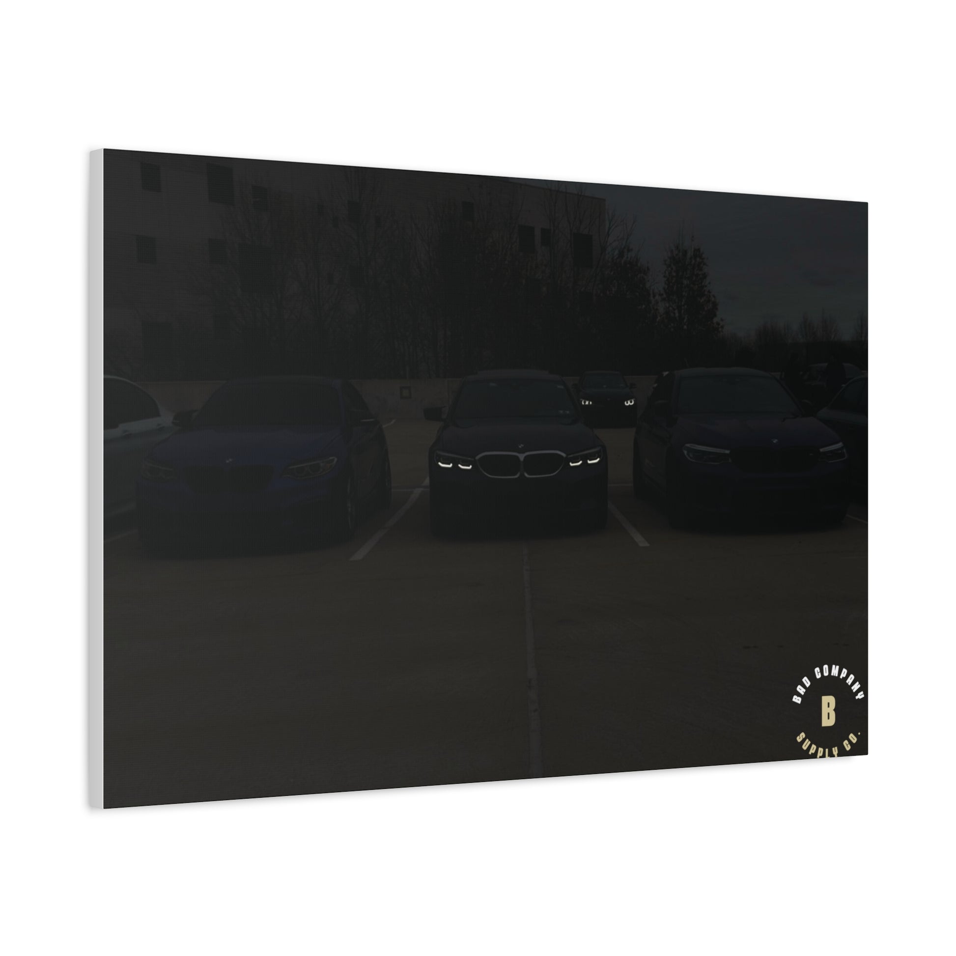 A bold shot of BMWs lined up with their signature headlights glowing, captured in a moody parking lot scene. Printed on premium matte canvas, this piece brings an understated yet powerful presence to any wall. Perfect for car enthusiasts who appreciate sleek design and raw automotive attitude.